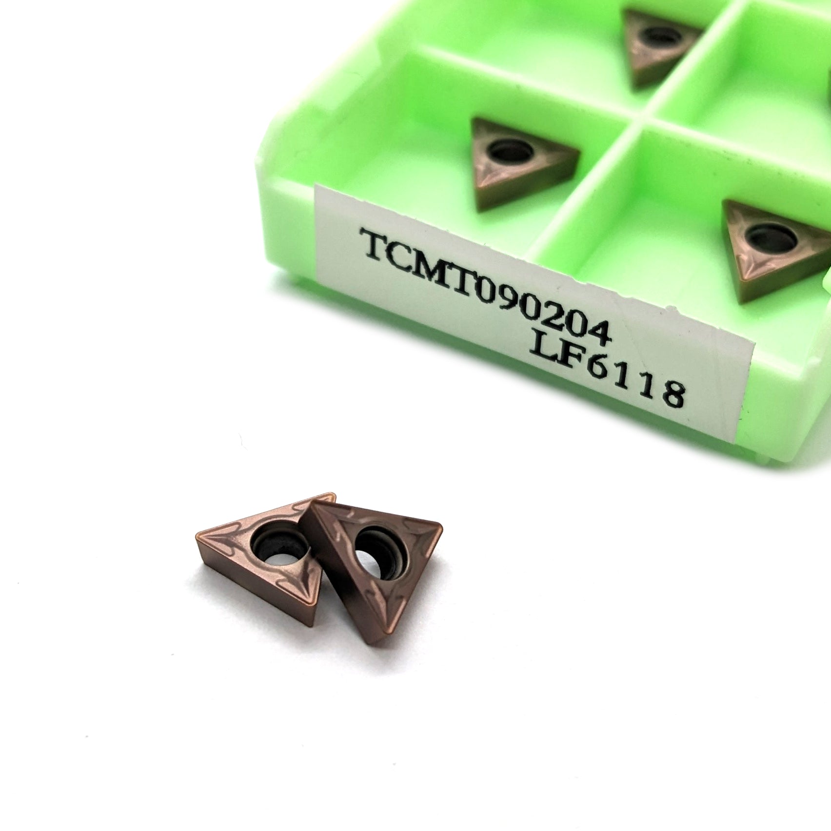 Box of 10 TCMT090204 triangular carbide inserts.